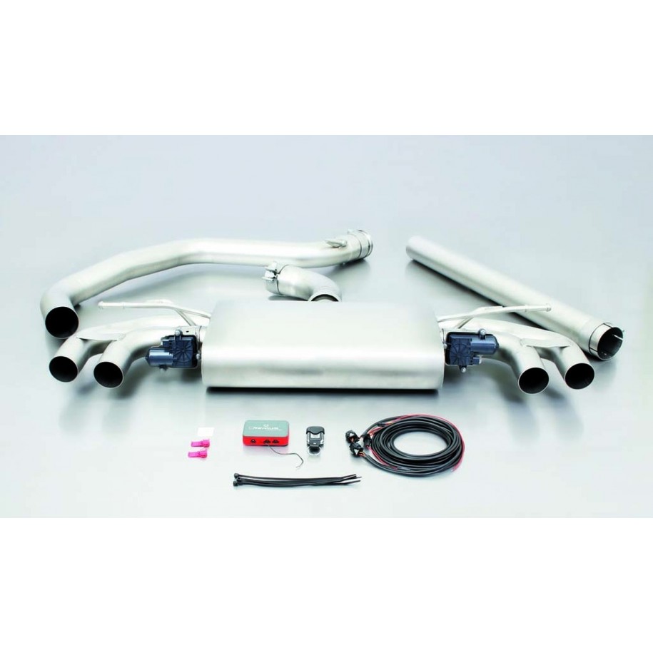 Remus-Auspuffsystem links/rechts, nicht resonant, mit integrierten Ventilen, einschließlich Audio-Controller-Modul mit 4 x 84 mm abgewinkelten Endrohren, gerollter Kante, Chrom – Golf Mk7 Schrägheck 2.0 GTI Clubsport 195 kW CJXE 2016
