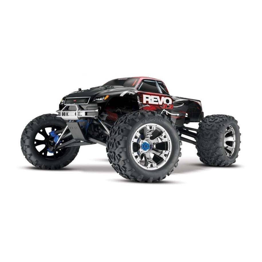 The Traxxas Revo 3.3 with TRX3.3 petrol engine at its release created a real revolution in the sector of 4WD Monster Truck type off-road models. Extremely powerful, with traction on 4 wheels, adjustable hydraulic shock absorbers positioned inside the frame with cantilever-type operation, molded tub frame in composite material, 2-speed gearbox and possibility of reverse gear engagement via the remote control, which is already set up for telemetry in real time. The internal combustion engine is started by means of a simple electric device, which has been tested for years. Absolute leader of the Monster Trucks with internal combustion engine.