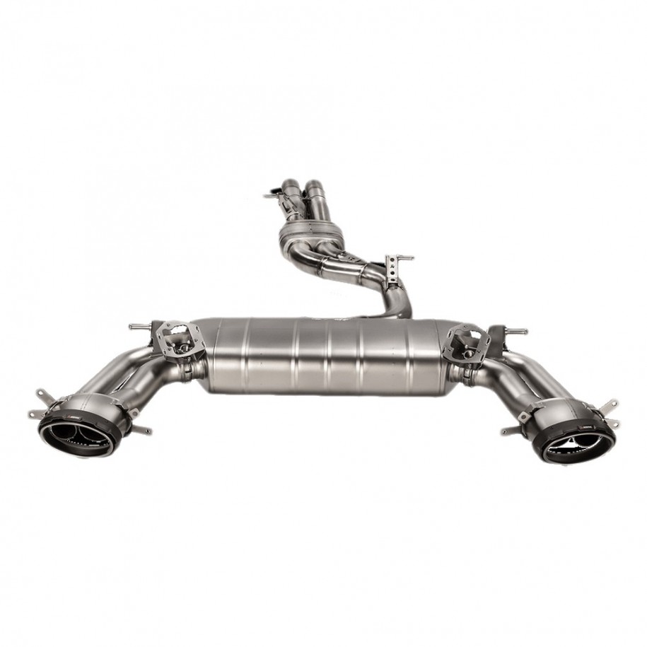 Ce système est construit avec des tuyaux en titane de haute qualité et un silencieux, qui sont à leur tour reliés aux tuyaux d'échappement de la voiture avec un raccord en acier inoxydable et finis avec des embouts en fibre de carbone fabriqués à la main et un manchon intérieur en titane. Les boîtiers des deux soupapes d'échappement ont été fabriqués dans la fonderie interne d'Akrapovic, un pour chaque côté du silencieux afin d'adapter le son au système. Les tonalités distinctives du moteur cinq cylindres délivrent un bourdonnement apaisant et agréable en mode confort, avec un rappel raffiné du potentiel de la voiture lors de la conduite en mode dynamique, puis atteignant l'expérience audible maximale lors de l'accélération. Un diffuseur arrière en fibre de carbone brillant fabriqué à la main est disponible en option, tout comme le kit de son Akrapovic également en option pour offrir un contrôle total sur les tonalités d'échappement. Avec l'installation du kit de son Akrapovic, le certificat d'approbation de type ECE n'est pas valide. Le système est homologué ECE pour les véhicules équipés d'un filtre à particules Otto/essence.