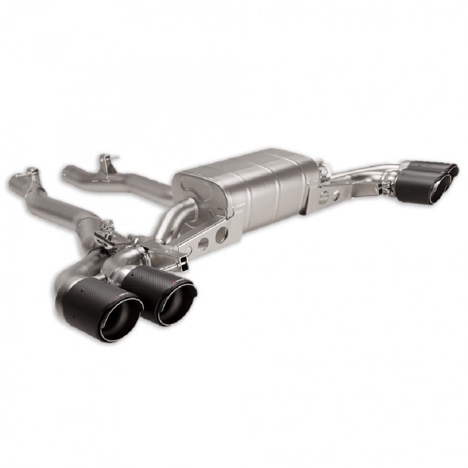 Costruito in titanio leggero di alta qualità con alcune parti forgiate nella fonderia di Akrapovic, questo sistema ridurrà il peso dell'impianto di scarico. Sviluppato per offrire guadagni di potenza e di coppia su tutta la curva di coppia, con maggior guadagno a bassi regimi, migliorerà la reattività e la guidabilità. Il sistema emette un suono nettamente diverso dal sistema di scarico stock, più evidente in caso di cambi di marcia, ritorni di fiamma e accelerazioni. I terminali di scarico in fibra di carbonio sono stati realizzati e progettati per adattarsi perfettamente al diffusore in fibra di carbonio opzionale. Sono disponibili anche calotte per specchietti in fibra di carbonio opzionali per migliorare ulteriormente l'aspetto della vettura.