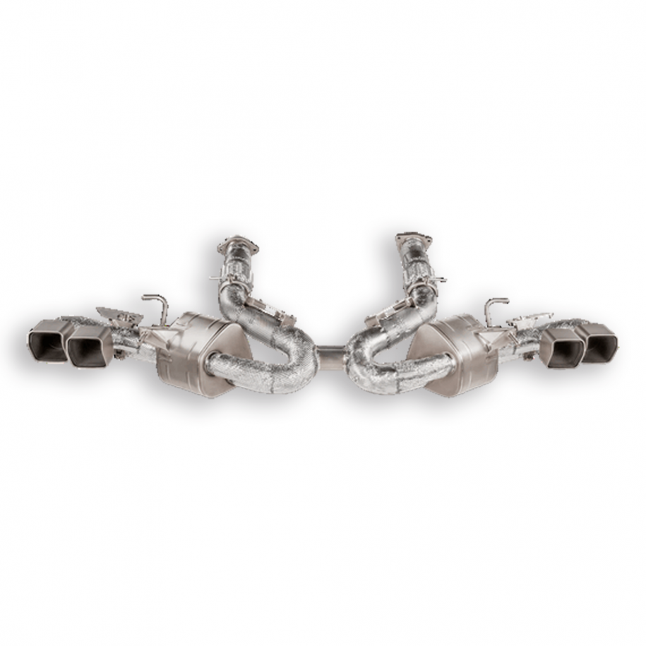 Questo scarico è stato progettato per offrire prestazioni, suono esaltante e piacere di guida, senza compromessi sul comfort. Realizzato in titanio leggero e di alta qualità, l'impianto Slip-On (Titanio) è più leggero di oltre il 47% rispetto a quello sportivo di serie. Due set di terminali di scarico quadrati in titanio splendidamente rifiniti, con interni neri, sono rivestiti per una migliore durata e resistenza ai graffi. Lo scarico è progettato per controllare il flusso di gas e fornire un suono perfetto: il motore V8 pulsa ai bassi regimi, e si evolve gradualmente in un ricco ruggito man mano che i giri aumentano, creando un piacere uditivo. I due tubi che collegano i lati sinistro e destro del sistema hanno diametri diversi per fornire una maggiore rigidità al sistema e migliorare l'esperienza sonora complessiva. I tubi sono completamente isolati per evitare che il calore in eccesso influisca su altre parti dell'auto. Con una perfetta risposta dell'acceleratore e fornendo un aumento di potenza di 3,4 kW (4,6 CV) a 5.250 giri/min e un guadagno di coppia di 8,2 Nm a 3.100 giri/min - dati ottenuti sul banco prova Akrapovic con una Corvette Stingray con impianto di scarico sportivo di serie - il sistema non necessita di rimappatura ed è destinato esclusivamente all'uso su circuiti e percorsi chiusi. Sono disponibili set di tubi di collegamento opzionali, con o senza catalizzatori, per migliorare ulteriormente lo Slip-On. QUESTO PRODOTTO NON SODDISFA I REQUISITI DI CONFORMITÀ ALLE EMISSIONI PER L'USO STRADALE O AUTOSTRADALE.